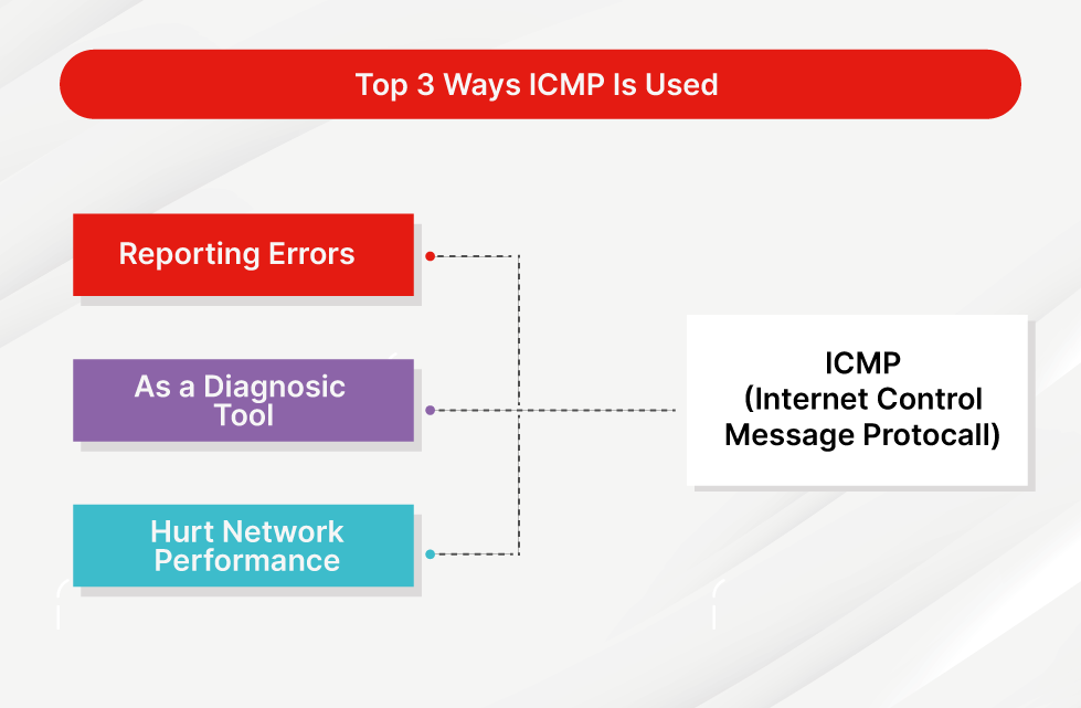 Note: ICMP doesn’t use ports because it’s not designed for data transfer. Instead, it sends control and error messages. As a result, it’s often blocked in enterprise environments to mitigate risks from attacks like ICMP flooding or Ping of Death.